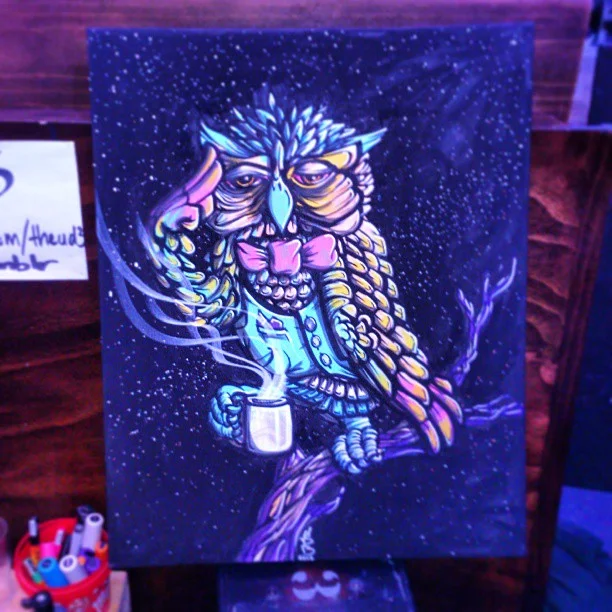 Feeling it a little bit thismorning after painting this guy for Elcamino live art night. #hangover #drink #drank #drunk #owl #upallnight #art #streetart #ink #starry #sky #colour #design #designer #artist #eyes