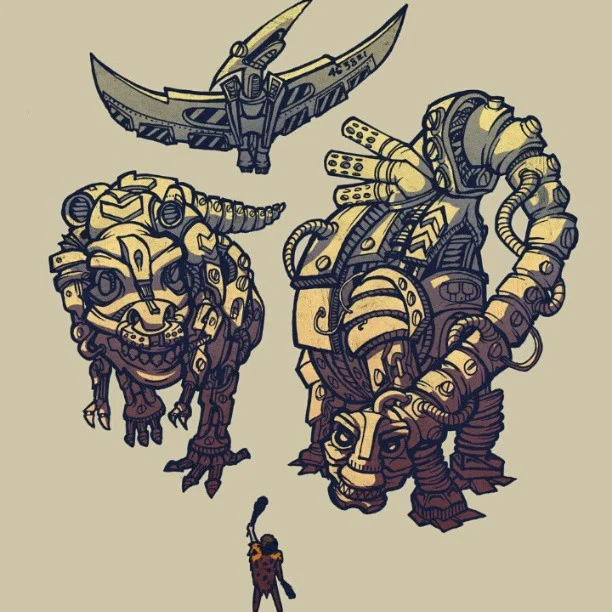 Robot dinosaur uprising. Collab with Ben Marriott #dinosaur #illustration #art #design #drawing #sketch #t-shirt #tee #robot #collaboration #colour #computer #graphic #graphics #caveman